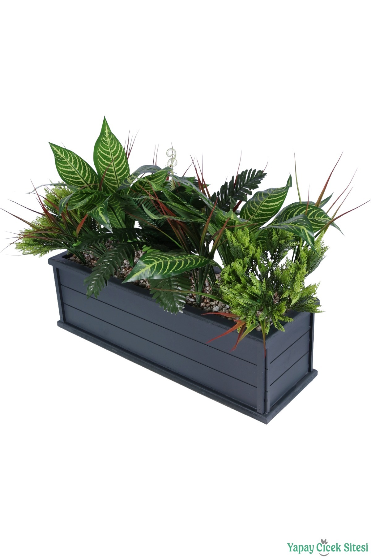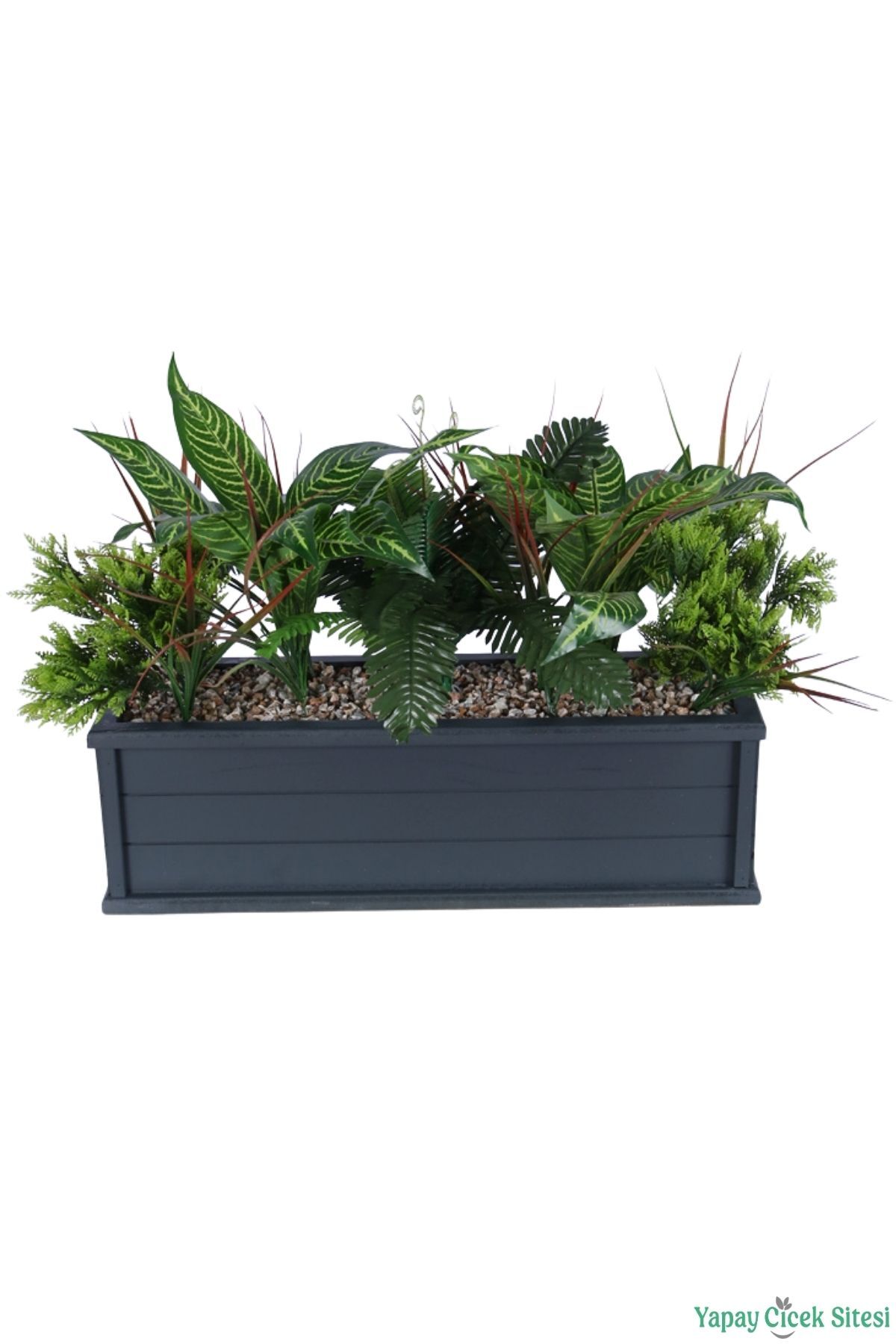 Modern Tasarım: Antrasit renkli, minimalist ve dikdörtgen formda şık bir ahşap saksı içerisinde sunulmaktadır.