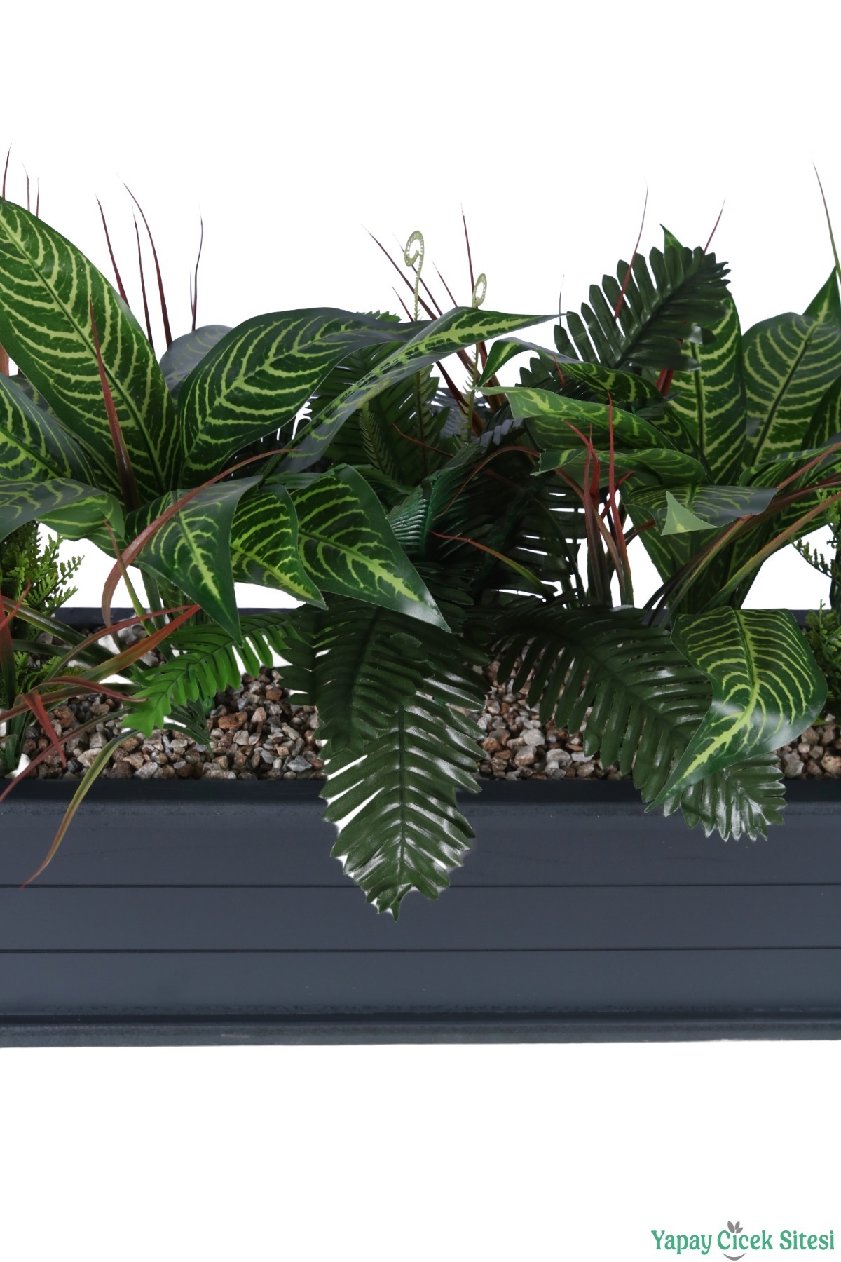 Zengin Bitki İçeriği: Gerçekçi dokulu Difenbahya yaprakları, eğrelti otu ve çeşitli yeşil garnitürlerle dolgun bir tanzim oluşturulmuştur.