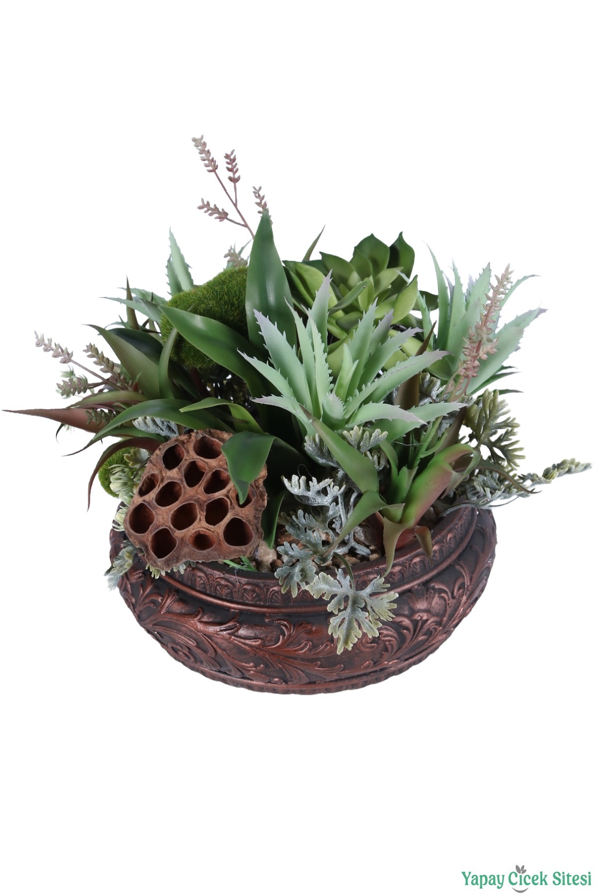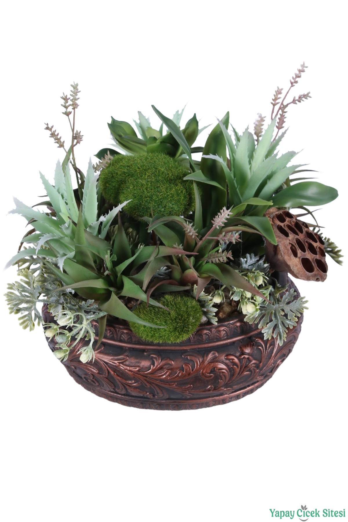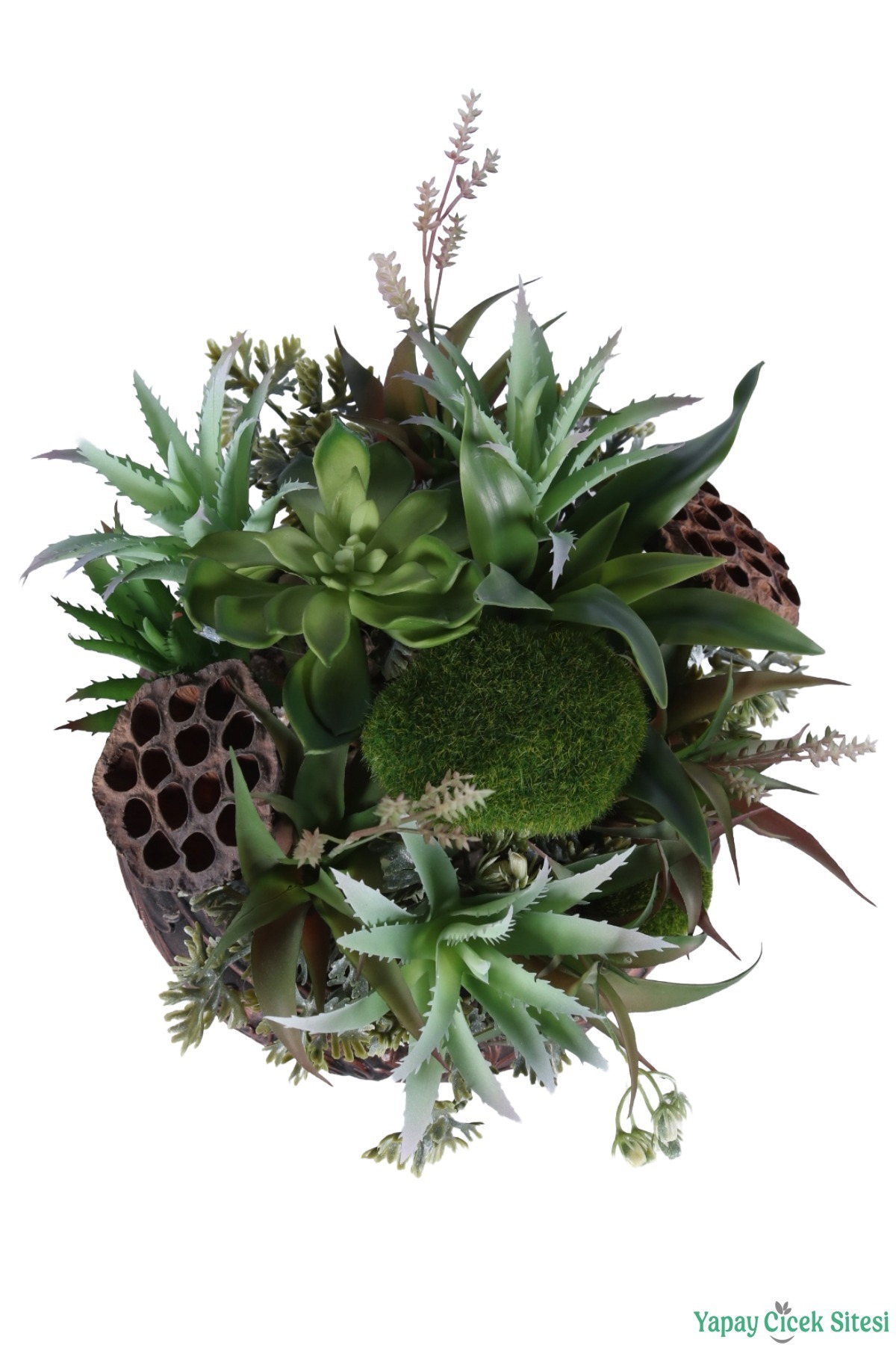• Bitki Kompozisyonu: Aranjmanda farklı formlarda sukulentler, agave yaprakları ve saksı kenarından sarkan inci tanesi (senecio) bitkileri kullanılmıştır.