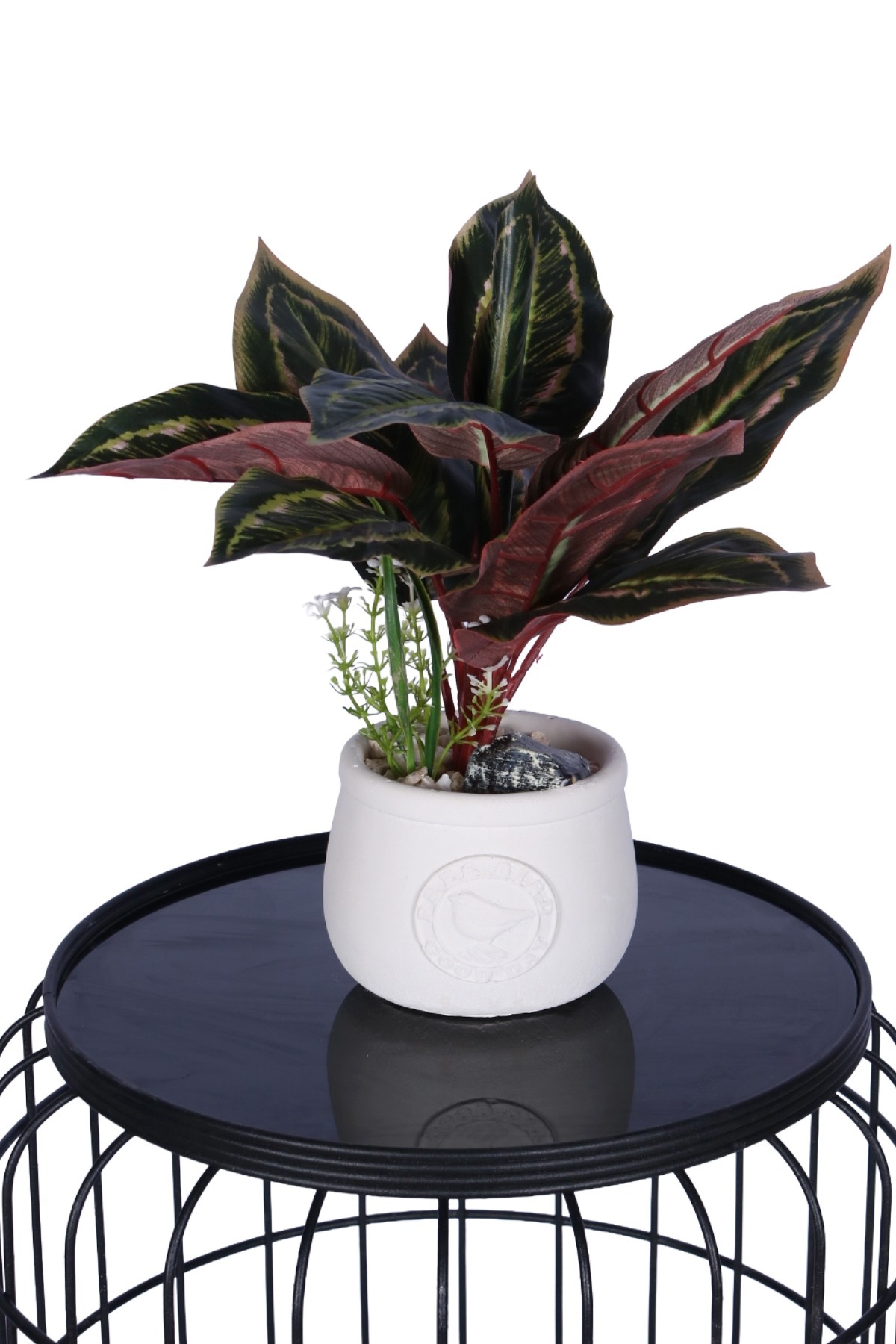Doğal Aranjman Detayları: Saksı içerisinde kullanılan beyaz çakıl taşları, dekoratif kaya parçası ve ana bitkiyi destekleyen ince yapraklı küçük yeşillik, minyatür bir bahçe görünümü sunar.