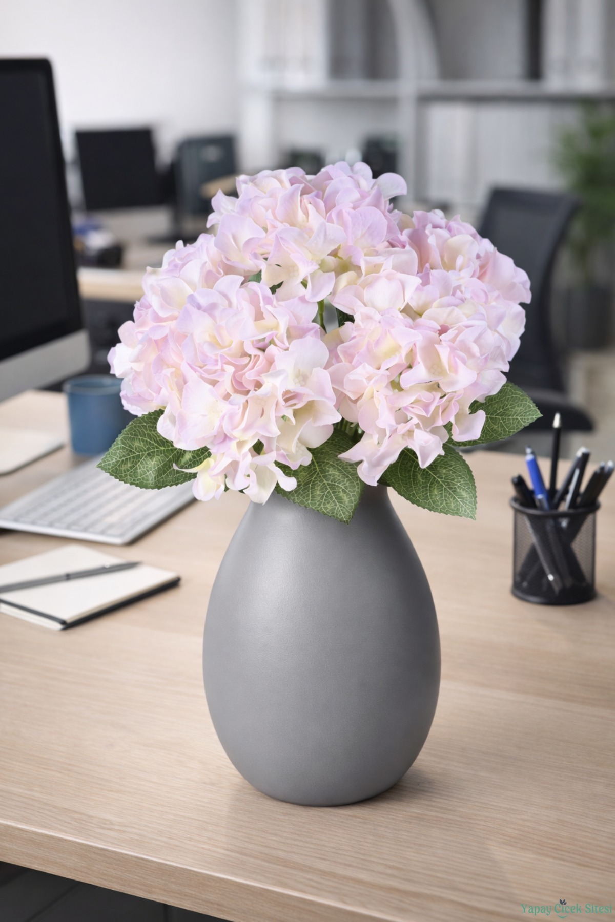 Geniş yapraklı ortanca görünümüyle doğal ve dolgun bir görünüm sunar.