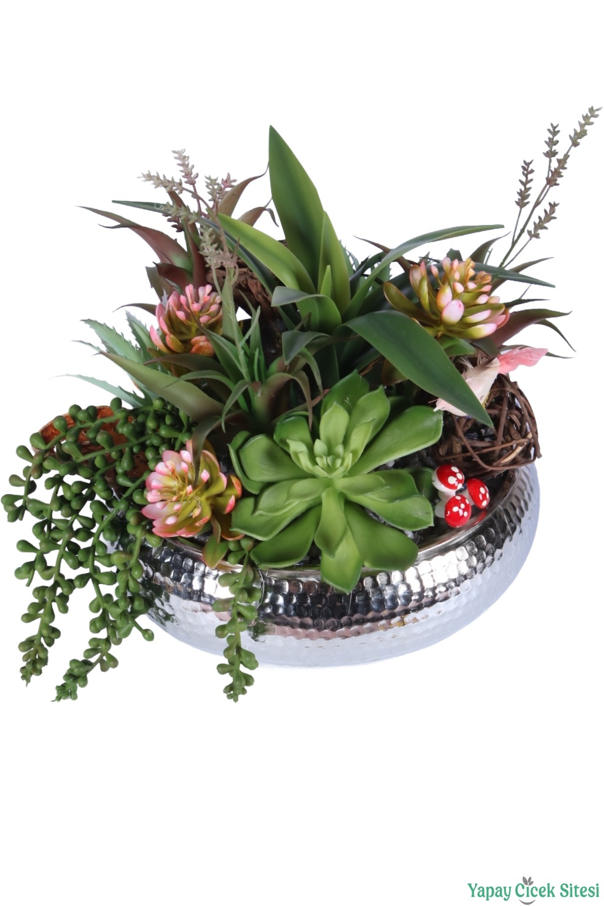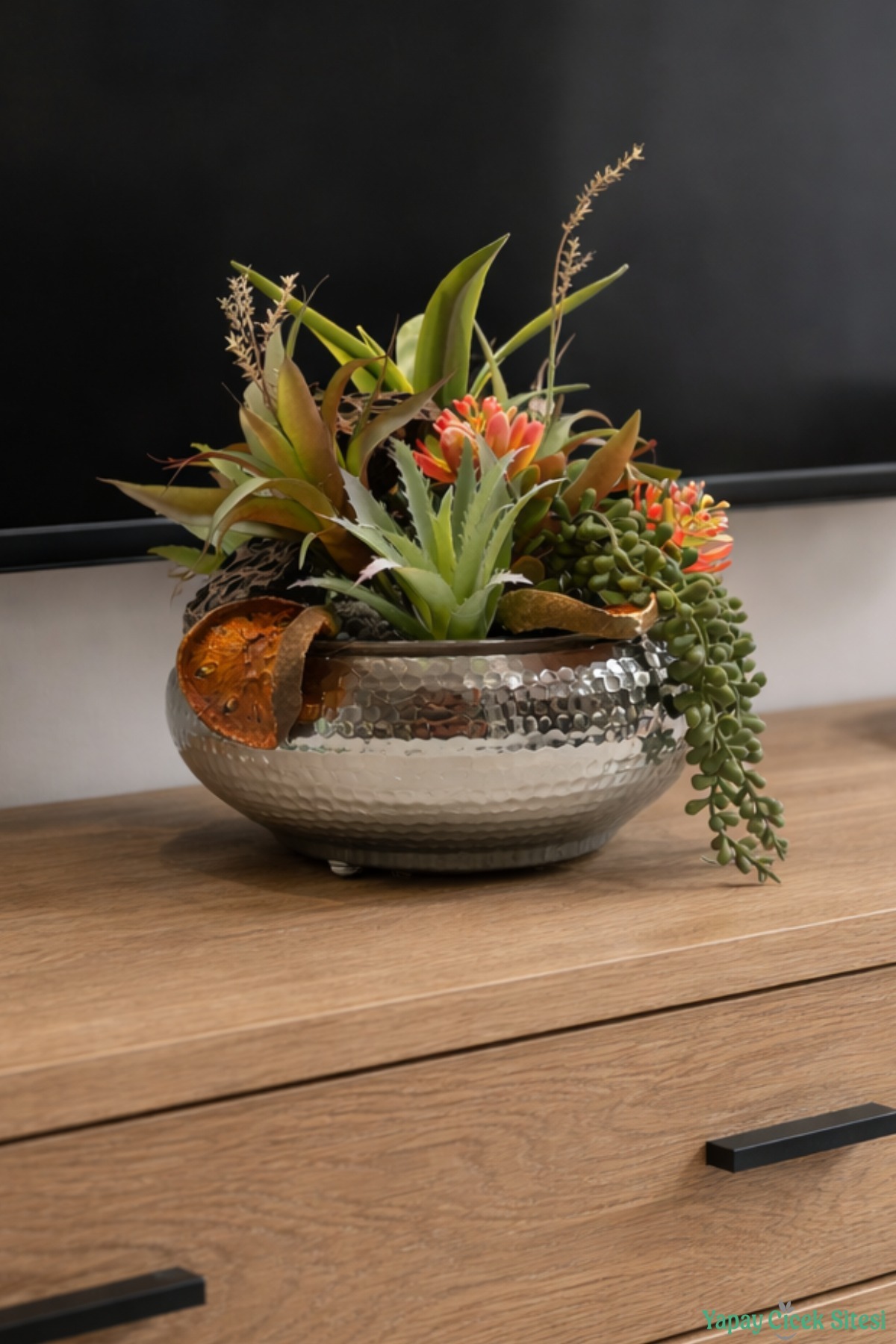 Zengin Sukulent Aranjmanı: İçeriğinde farklı türlerde yapay sukulentler, geniş yapraklı bitkiler ve saksı kenarından sarkan zarif tespih çiçeği (inci tanesi) yer almaktadır.