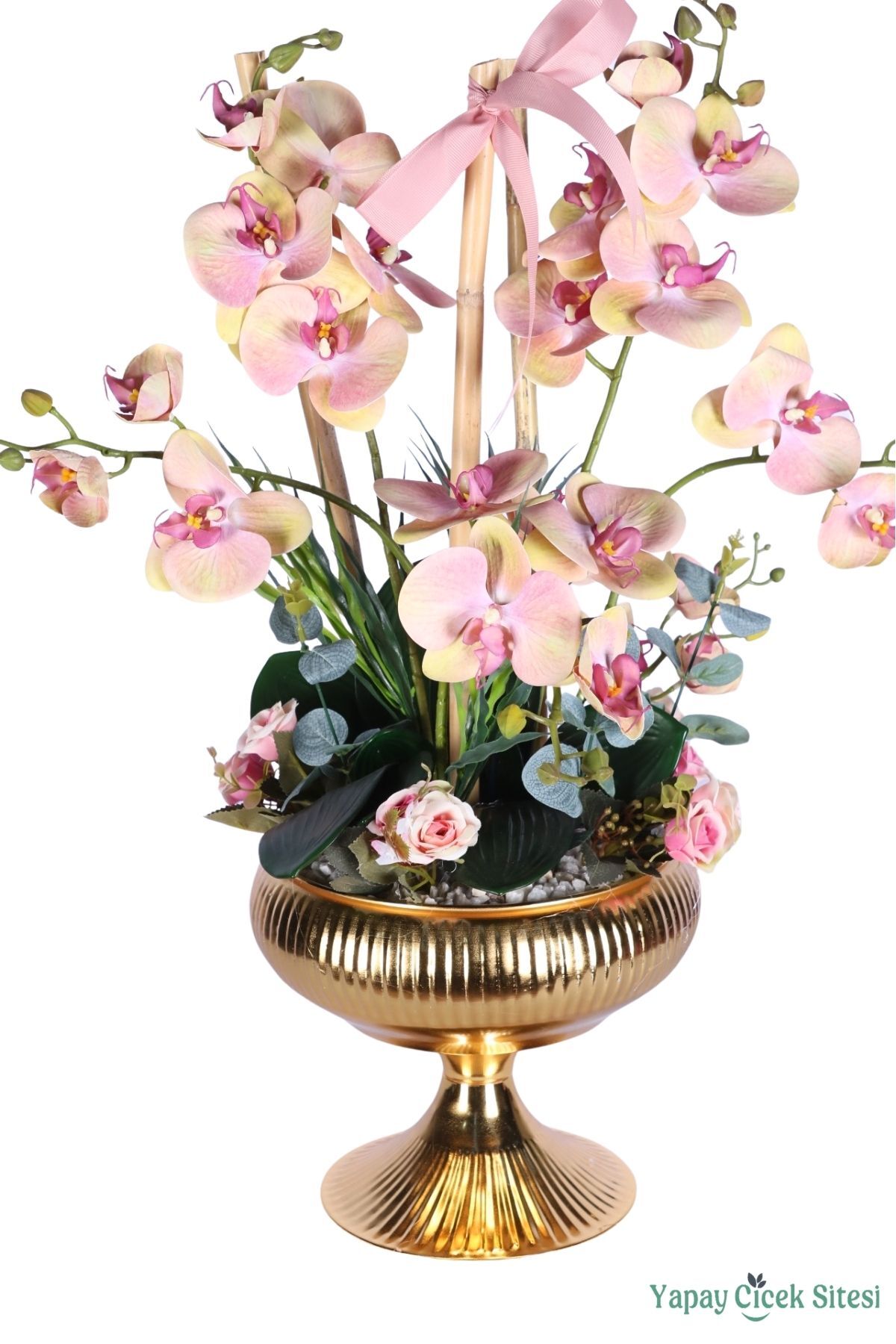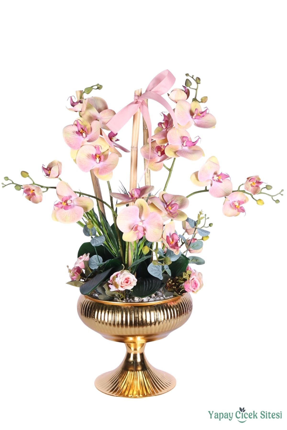 Şık metal saksı içerisinde hazırlanmış premium yapay çiçek aranjmanıdır