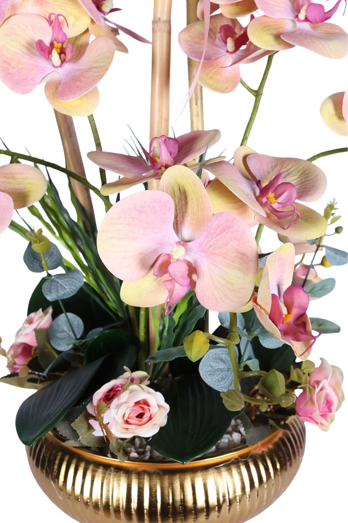 Orkide ve klasik bitki yapraklarının uyumlu birleşimiyle göz alıcı bir görünüm sağlar