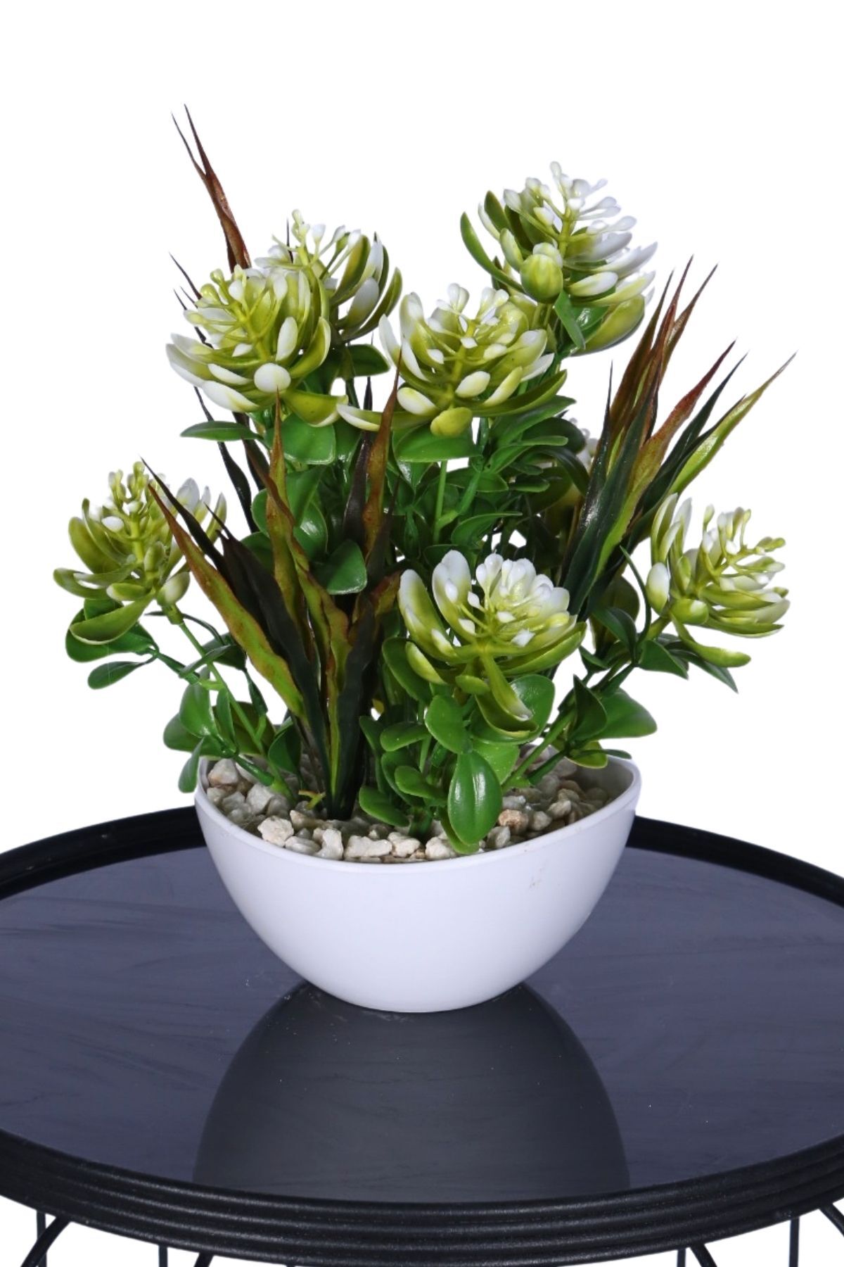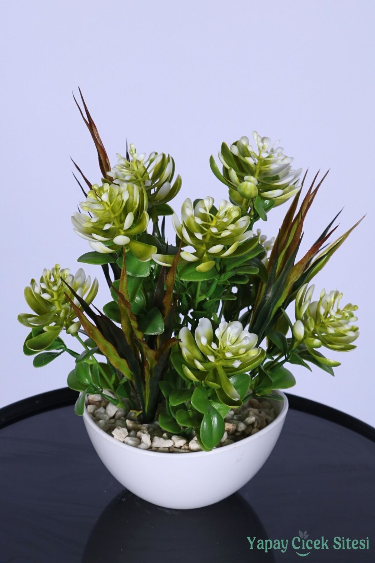 Canlı ve Doğal Görünüm: Farklı tonlardaki yeşil yapraklar ve beyaz çiçek formundaki sukulent başları ile gerçekçi bir doku oluşturulmuştur.