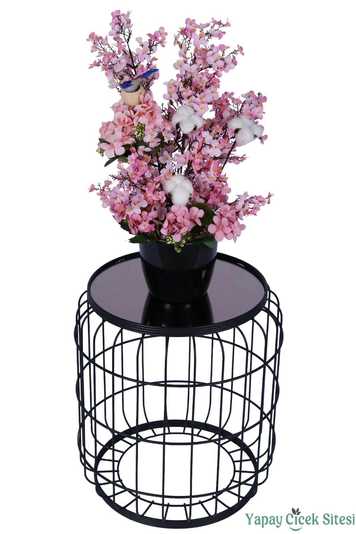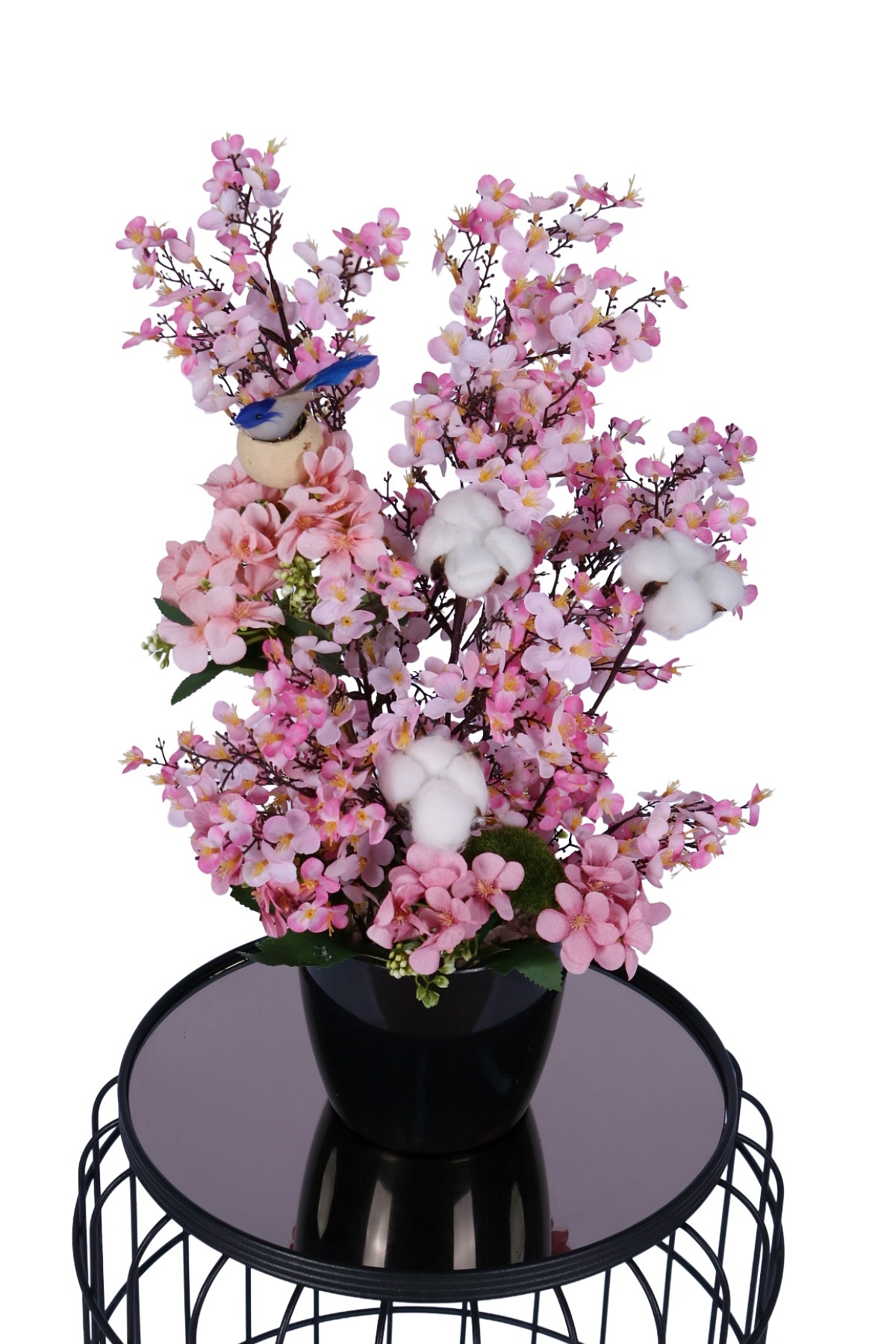 Yoğun çiçekli sakura dalları, beyaz pamuk detayları ve uyumlu yan çiçek kombinasyonu ile estetik ve dolgun bir tasarıma sahiptir.