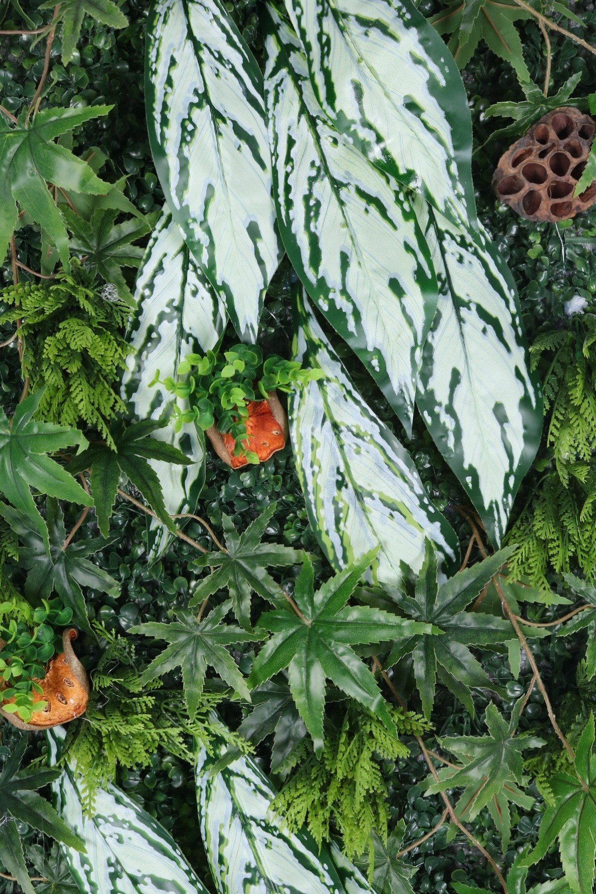 Doğal Çeşitlilik: Panel içerisinde kullanılan egzotik palmiye yaprakları, sarmaşıklar, eğrelti otları ve yosun detayları, gerçek bir "Dikey Bahçe" illüzyonu yaratır.