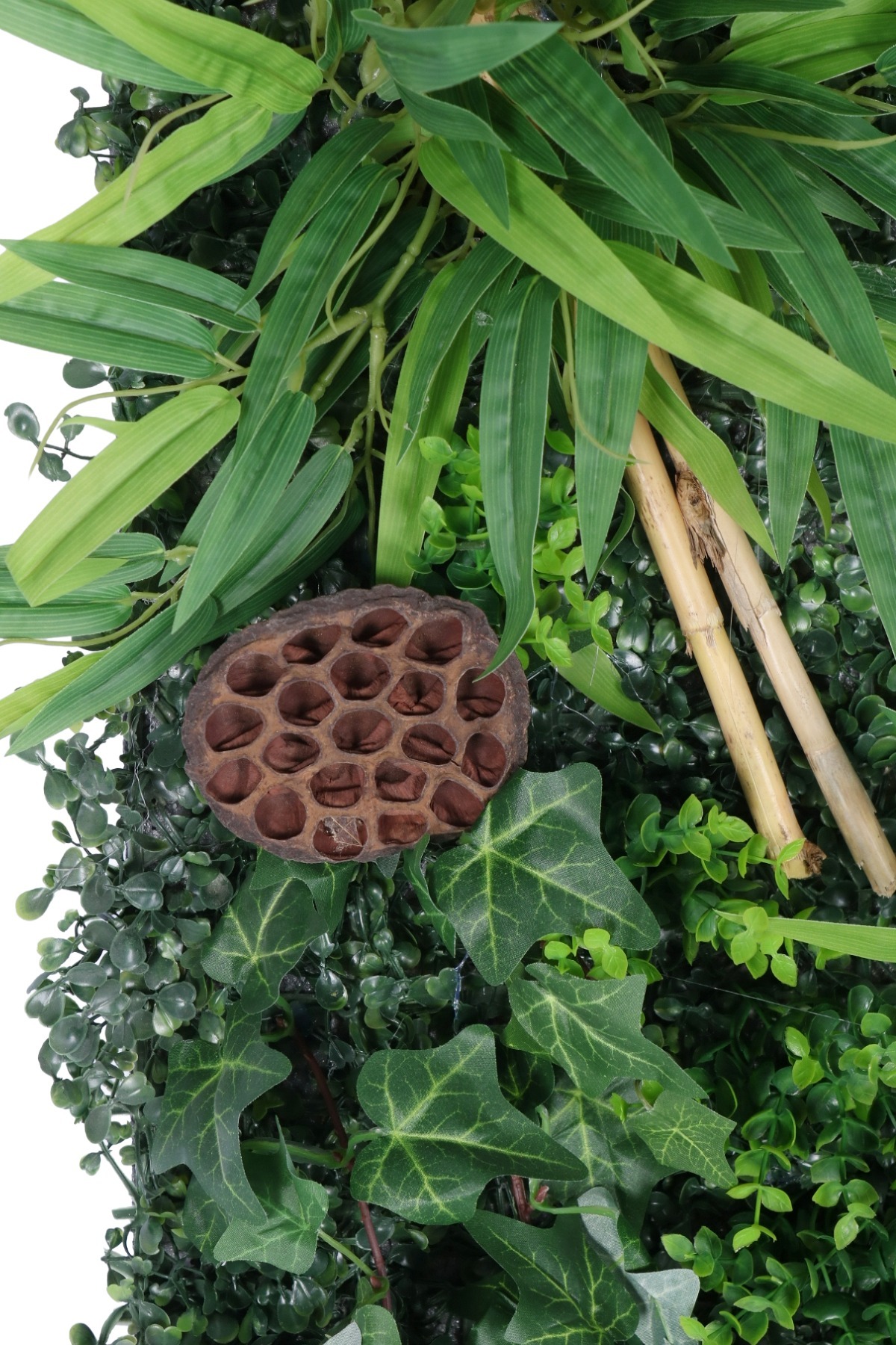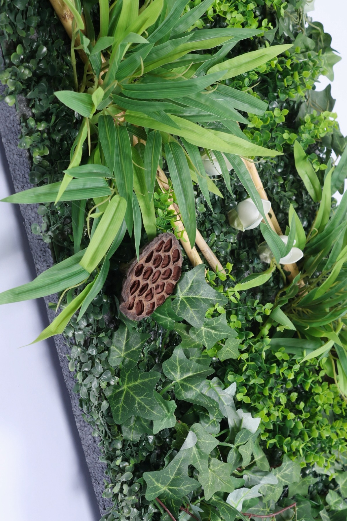 • Doğal Çeşitlilik: Panel içerisinde kullanılan egzotik palmiye yaprakları, sarmaşıklar, eğrelti otları ve yosun detayları, gerçek bir "Dikey Bahçe" illüzyonu yaratır.