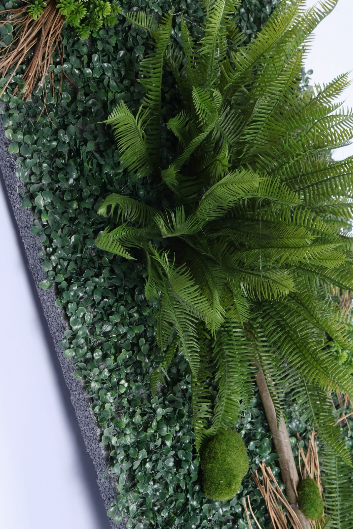 Doğal Çeşitlilik: Panel içerisinde kullanılan egzotik palmiye yaprakları, sarmaşıklar, eğrelti otları ve yosun detayları, gerçek bir "Dikey Bahçe" illüzyonu yaratır.