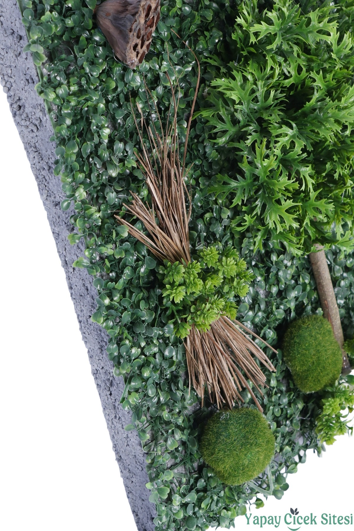 • Zengin ve Katmanlı Görünüm: 3 cm kalınlığındaki dayanıklı EPS strafor köpük üzerine titizlikle sabitlenen bitkiler, toplamda 10 cm'lik bir derinlik oluşturur. Bu hacimli yapı, sıradan düz panellere göre çok daha gerçekçi ve premium bir görünüm sunar.