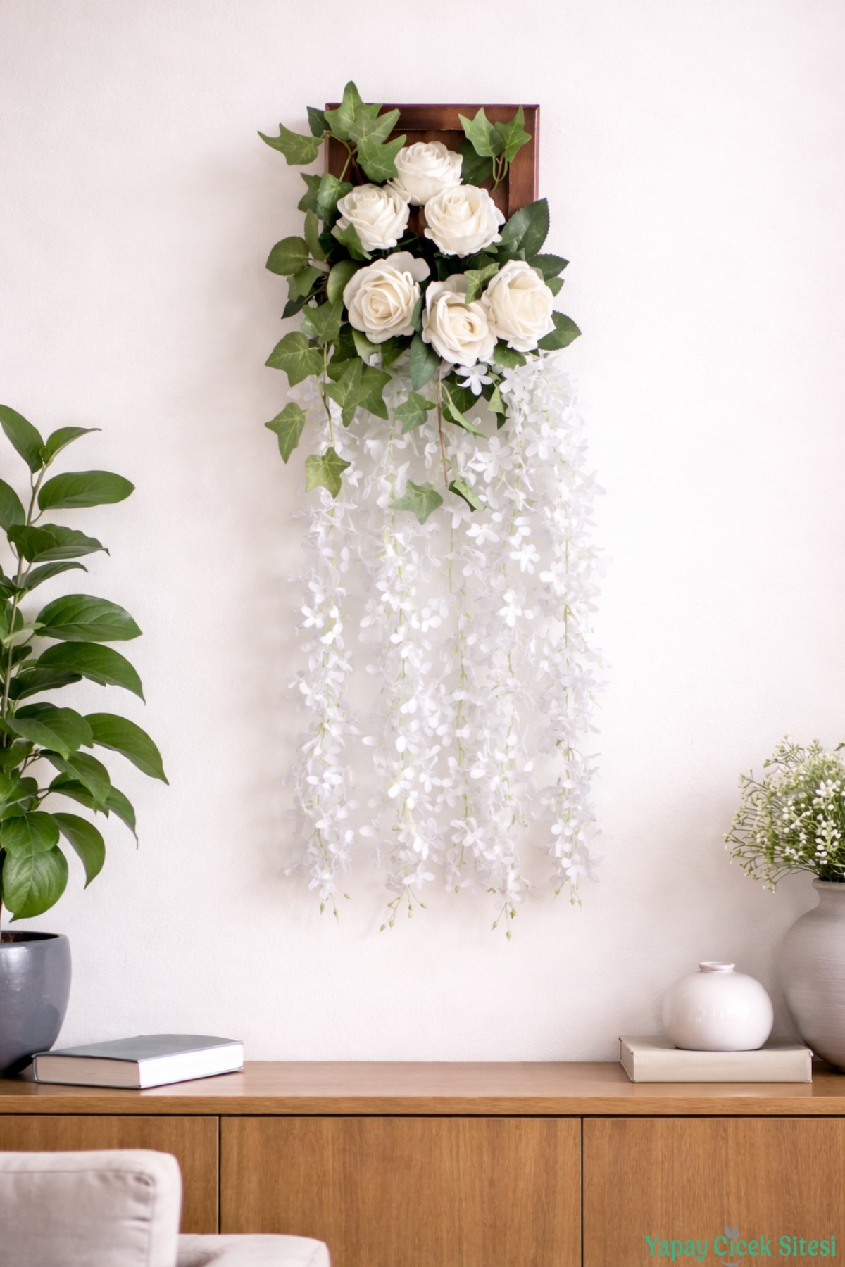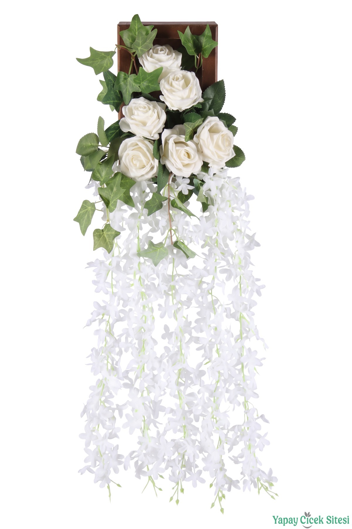 Gerçek görünümlü beyaz güller ve sarkıt çiçek detayları ile zarif görünüm